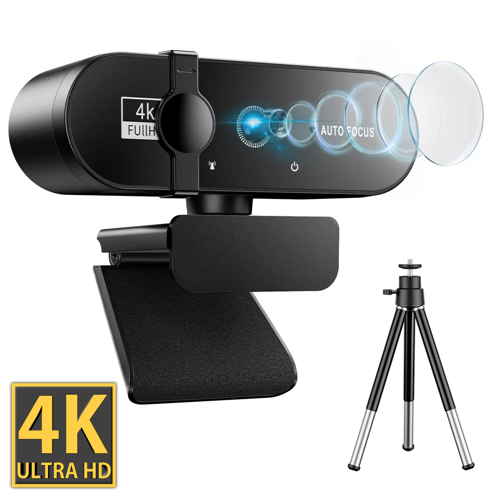 4K Clip-On Web Camera (30 FPS, Privacy Cover, Built in Microphone w/ Noise Cancellation, Autofocus, Tripod)